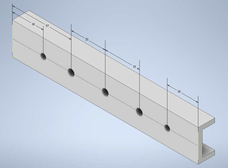 We have already applied the planned drilling pattern for the lights and rivets to a shelf as an example. The two outer holes are for the rivet connection, the 3 middle ones are each for an LED.